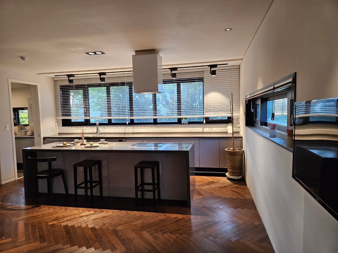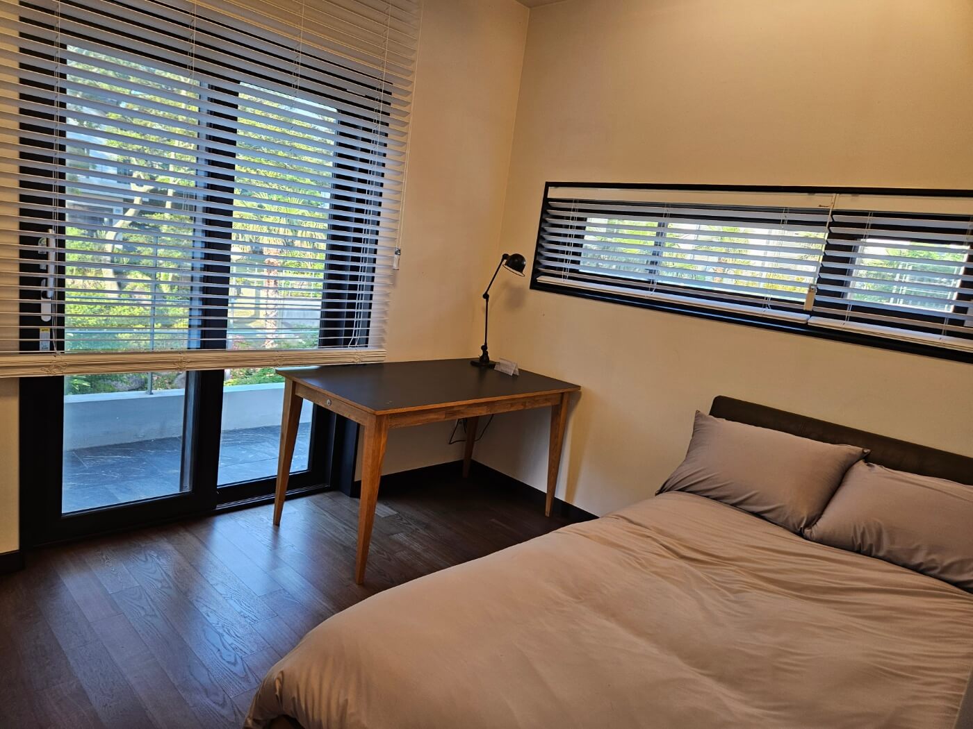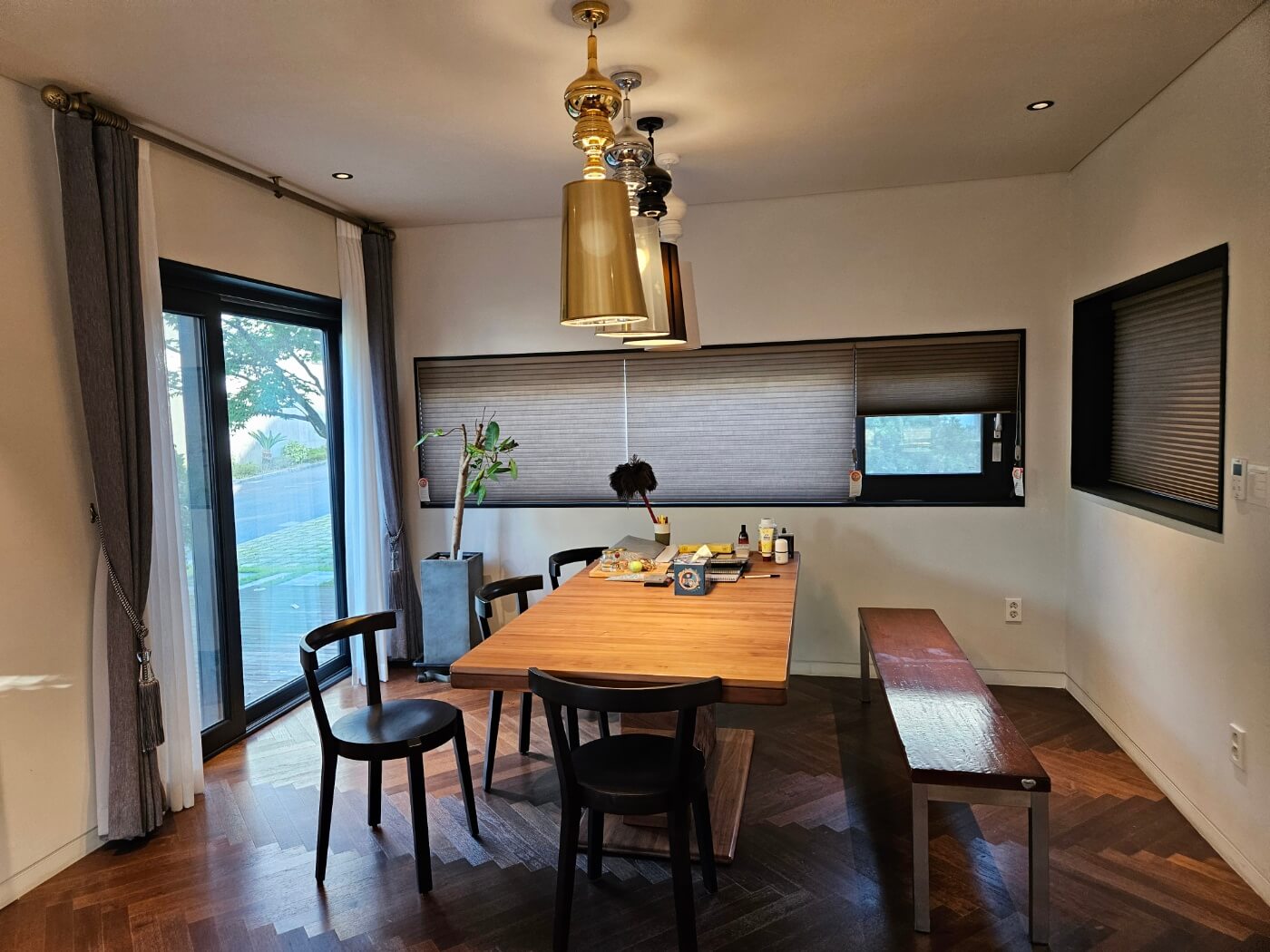 1층은 현관을 중심으로 거실과 주방이 양쪽으로 나뉜 구조입니다. 심플하고 모던한 인테리어의 거실은 높은 층고와 큰 창문으로 밝고 개방감이 느껴집니다. 파티오 공간은 난로와 폴딩도어가 설치되어 있어 계절에 관계없이 활용도가 높습니다. 2층은 침실이 모여 있는 구조로 보다 아늑한 분위기를 제공합니다. 각 침실은 간접등과 따뜻한 색감으로 꾸며져 있으며, 테라스와 연결되어 있어 개방감을 줍니다. 2층에는 보조 주방도 있어 편리한 생활이 가능합니다.
