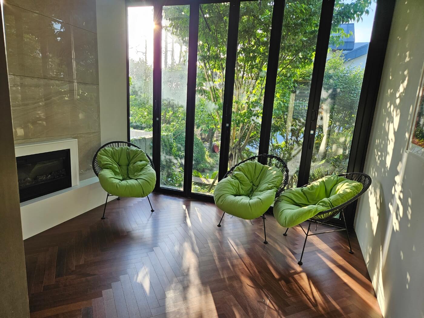 1층은 현관을 중심으로 거실과 주방이 양쪽으로 나뉜 구조입니다. 심플하고 모던한 인테리어의 거실은 높은 층고와 큰 창문으로 밝고 개방감이 느껴집니다. 파티오 공간은 난로와 폴딩도어가 설치되어 있어 계절에 관계없이 활용도가 높습니다.