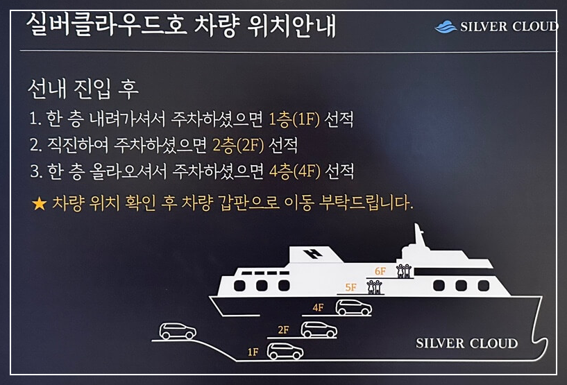 - 차량 주차는 선박 직원의 안내에 따라 진행.