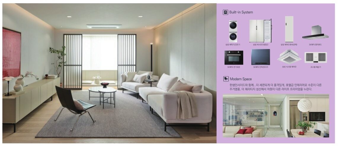 내부 인테리어는 한샘이 진행하며, 모던 스타일과 우수한 일조, 통풍, 공간활용도에 최적화된 설계와 시공으로 마감될 예정입니다. 사생활 보호를 위해 일부 세대는 4 Bay로 설계되어 있어 사계절 내내 쾌적하고 에너지를 효율적으로 관리할 수 있습니다. 또한, 대형 드레스룸 등의 수납 기능이 향상된 실용적인 공간설계가 장점으로 부각됩니다.