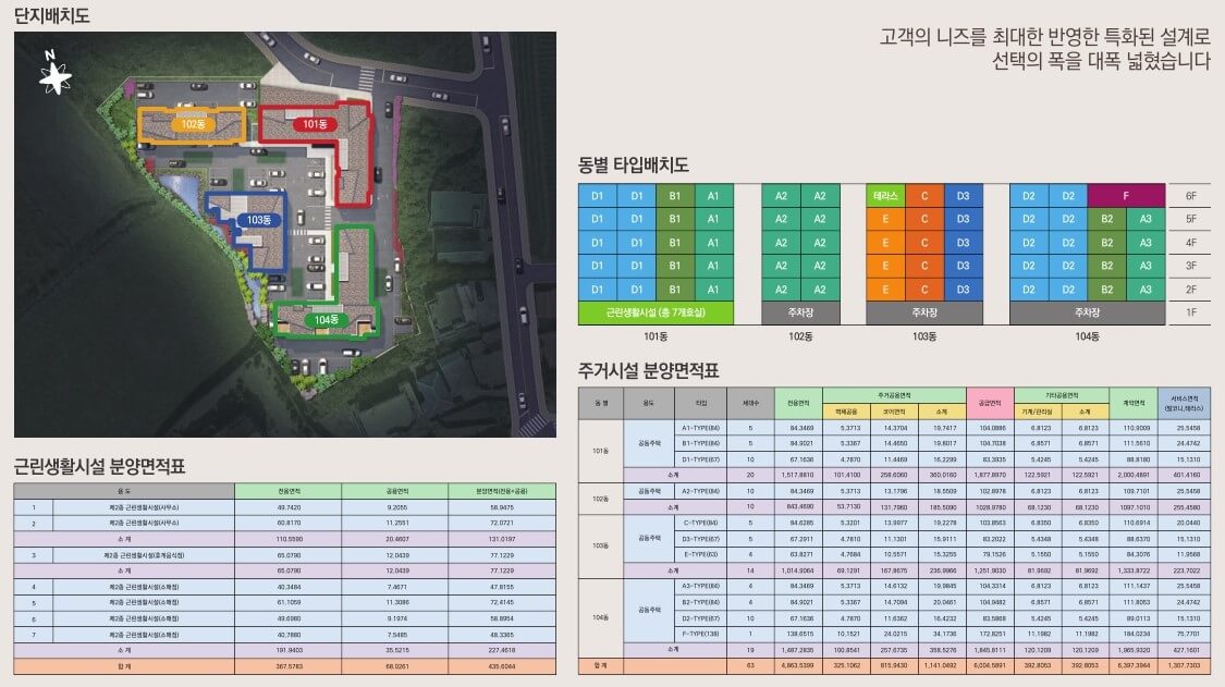 101동부터 104동까지의 4개 동으로 구성된 이 단지는 다양한 평면으로 구성되어 있습니다. A타입(84㎡, 19세대) , B타입(84㎡, 9세대). C타입(84㎡, 5세대). D1타입(67㎡, 20세대). D3타입(67㎡, 5세대). E타입(63㎡, 4세대) , F타입(138㎡, 1세대) 등 다양한 선택지가 제공되어 입주자들은 자신에게 맞는 공간을 찾을 수 있습니다.