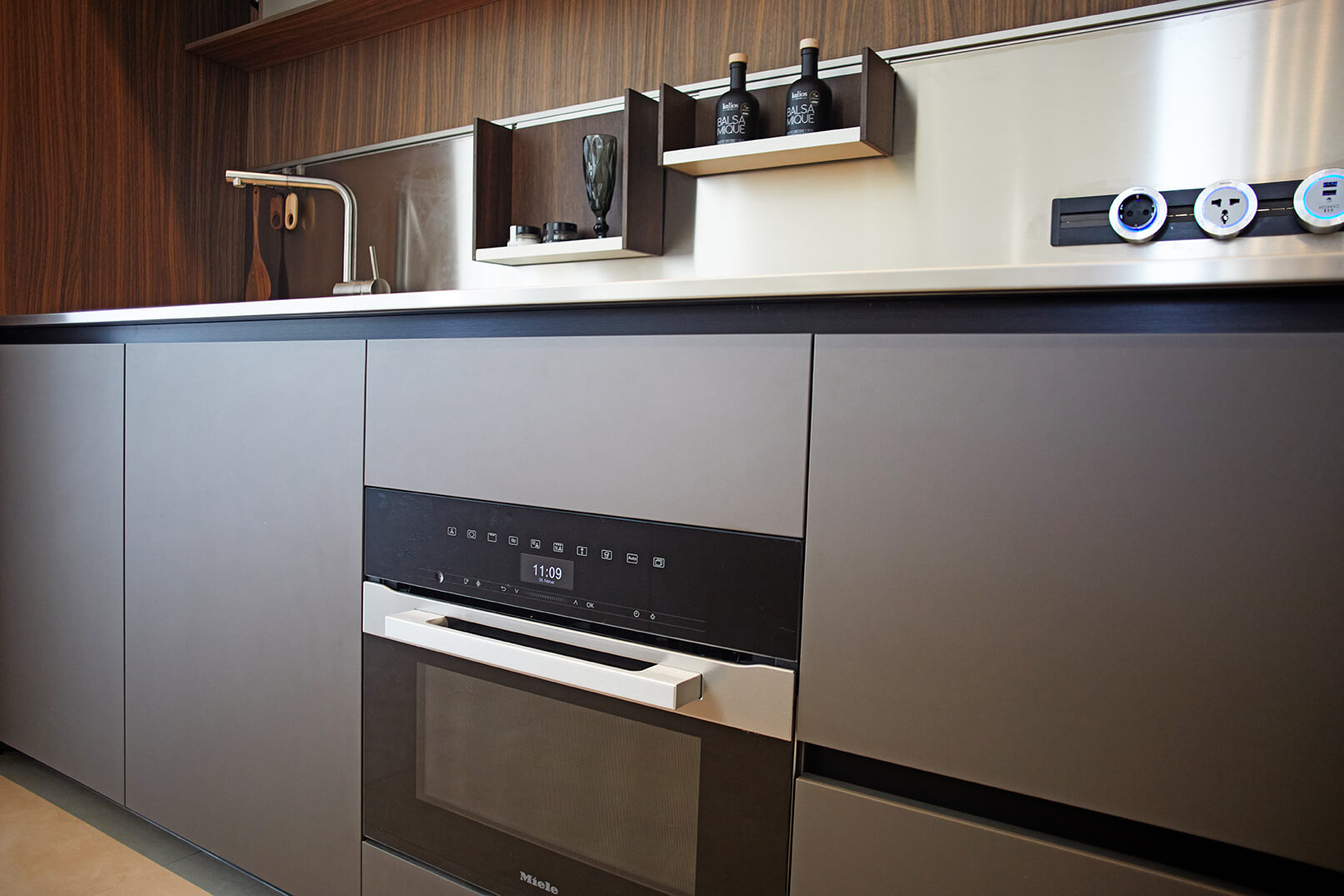 실내는 회색 톤과 따뜻한 우드 재질을 조합하여 모던하면서도 안정적인 주거 감각을 느낄 수 있습니다. 일부 세대에는 개인 수영장까지 설치되어 있어 고급 주거의 품격을 더합니다.