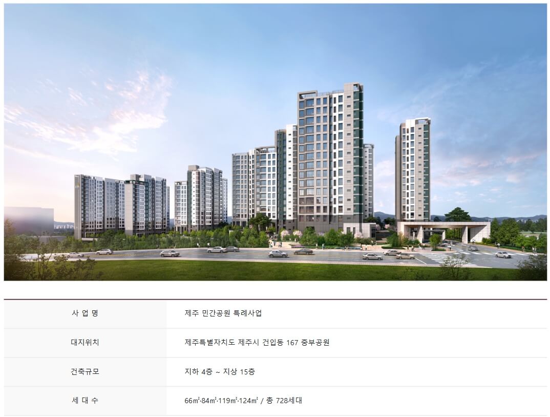 제주시 건입동 일원에 위치한 아파트 단지입니다. 이 단지는 지하 4층부터 지상 15층까지 총 12개 동으로 구성되어 있으며, 전용면적은 66~124㎡에 이르는 총 728 가구로 조성되었습니다. 이 중 653 가구는 전용면적이 84~124㎡인 일반분양으로 진행됩니다.