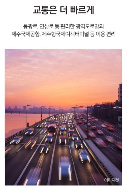 제일풍경채 센트럴파크는 동광로, 연삼로, 번영로 등 대로변이 인접하여 도심 접근성이 우수합니다. 또한, 제주국제공항과 제주항국제여객터미널 등의 이용도 편리하며, 하나로마트 제주점, 우당도서관, 국립제주박물관 등 다양한 교육, 상업, 행정 시설도 가깝게 위치해 있습니다.