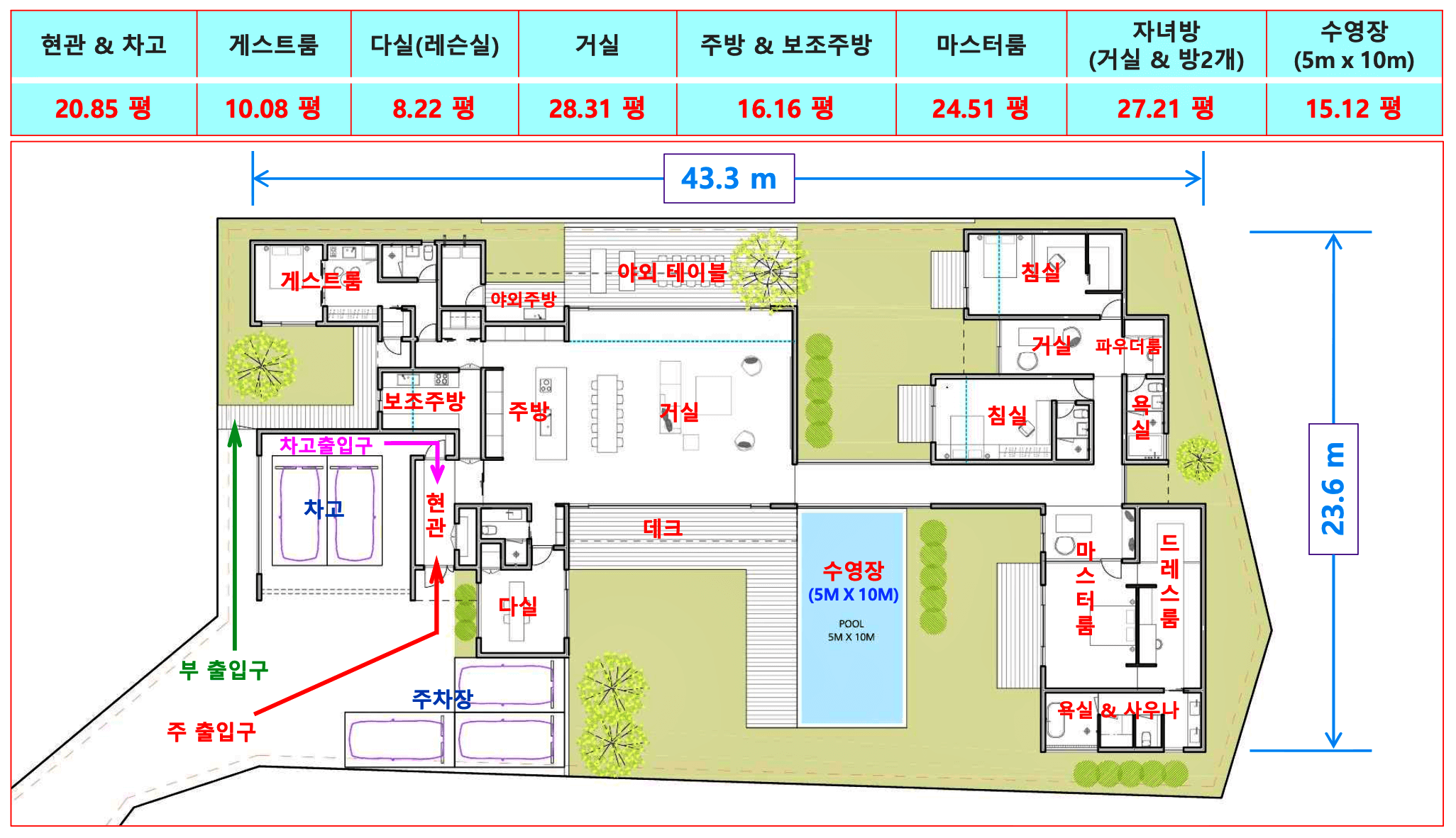 기타: 15.12 평 + α (수영장(5M X 10M) 등)