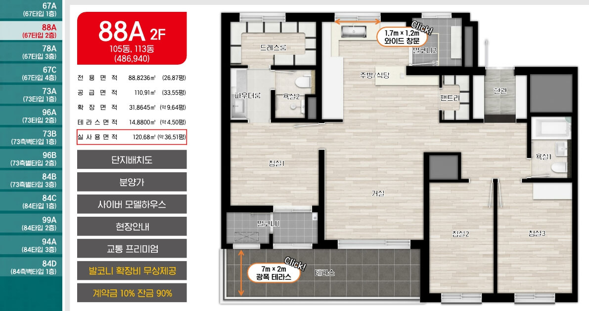 세대 내부에는 실수요자들이 선호하는 4Bay 혁신 평면설계를 적용하고 발코니 확장을 무상으로 제공합니다. 또한 개별 테라스와 다락공간을 제공하여 공간 활용성을 극대화하였습니다.