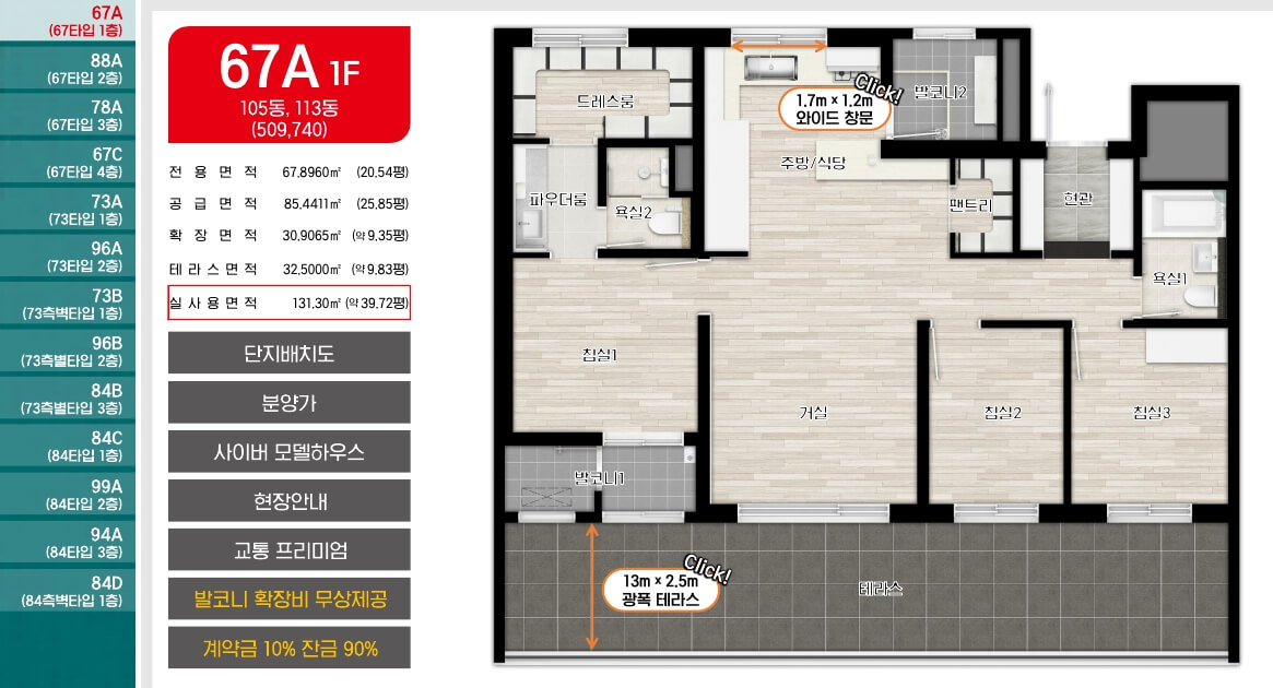 세대 내부에는 실수요자들이 선호하는 4Bay 혁신 평면설계를 적용하고 발코니 확장을 무상으로 제공합니다. 또한 개별 테라스와 다락공간을 제공하여 공간 활용성을 극대화하였습니다.