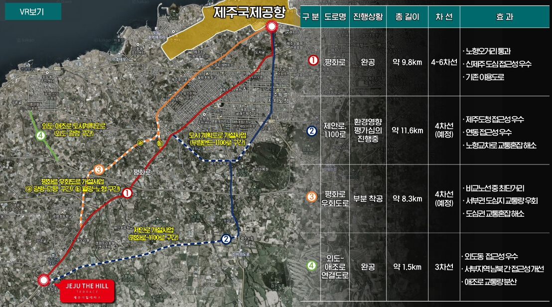 제주 더힐 테라스는 탁월한 교통여건을 자랑합니다. 평화로가 바로 앞을 지나가며 신도심과 구도심에 쉽게 접근할 수 있습니다. 또한 '제주 광령~도평 간 우회도로'의 건설이 추진되고 있어 교통정체를 우회하여 제주국제공항까지 원활하게 이동할 수 있고, 노형동 생활편의시설 이용이 더욱 편리해질 것으로 기대됩니다.