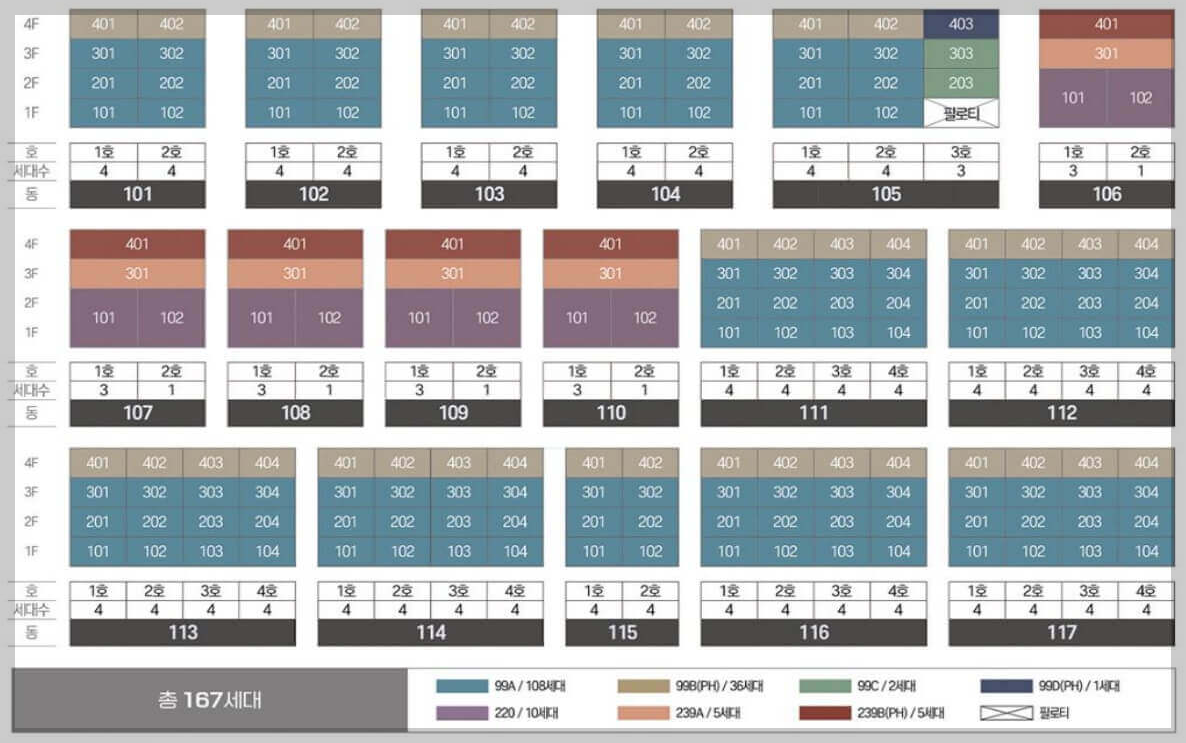 공동주택 전용 99㎡ 평형으로 약 88% 구성, 그 외 전용 220㎡ 이상의 대형 평형으로 구성