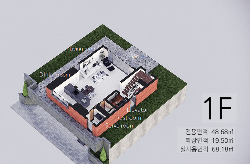 - 지하는 벙커 주차장과 멀티룸, 창고로 구성되어 있으며, 건축 과정에서 지형적인 단차를 활용하여 실질적으로는 1층처럼 느껴집니다.