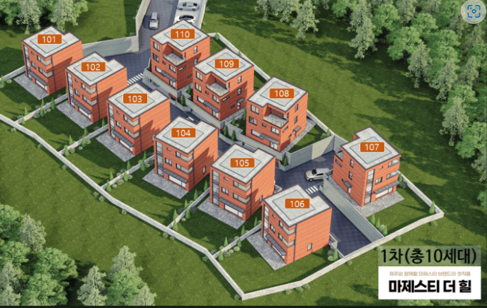 - 오등동 타운하우스 마제스티더힐은 적색 벽돌로 깔끔하게 마감된 건축물로, 지하 1층에서 지상 3층까지 총 10세대로 구성되어 있습니다.