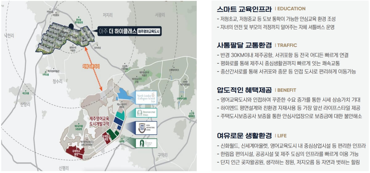 '아주 더 하이클래스'는 제주의 영어교육도시와 인접하여 교육 환경에 대한 우수한 접근성을 제공합니다. 제주 영어교육도시는 국제학교를 포함한 다양한 교육 시설을 보유하고 있으며, 약 4,000명의 학생들이 학습하고 있습니다.