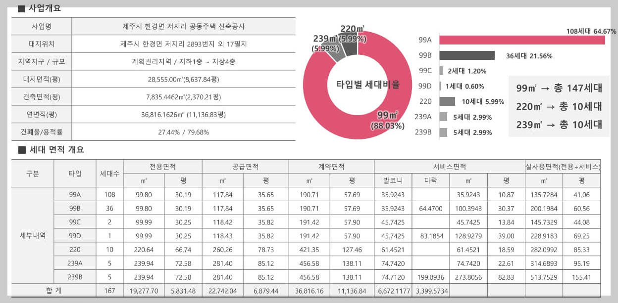 공동주택 전용 99㎡ 평형으로 약 88% 구성, 그 외 전용 220㎡ 이상의 대형 평형으로 구성