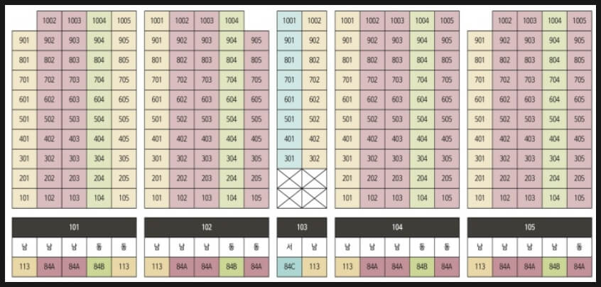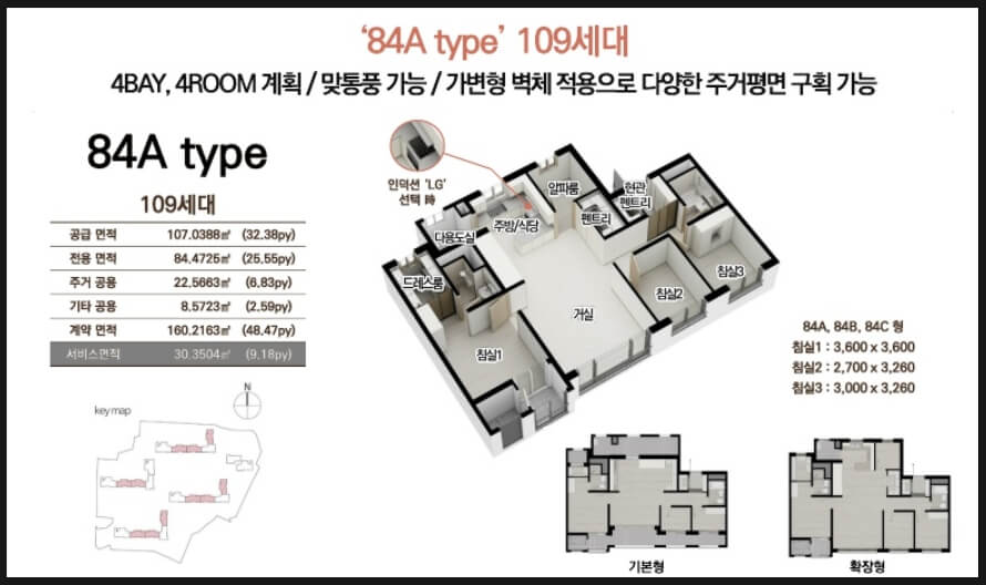 84㎡ 타입: 실용적인 판상형 구조, 넉넉한 수납공간(현관 워크인 수납장, 복도 팬트리) 113㎡ 타입: 대형 드레스룸과 마스터룸 제공, 개방감이 뛰어난 거실 설계 43평형 (133㎡): 대형 면적을 선호하는 분들을 위한 설계, 별장처럼 사용 가능 특히 84㎡ 국민주택 규모에서도 알파룸과 실내 팬트리가 적용되어 기존 크기보다 더욱 넓은 실내 공간 활용이 가능합니다.