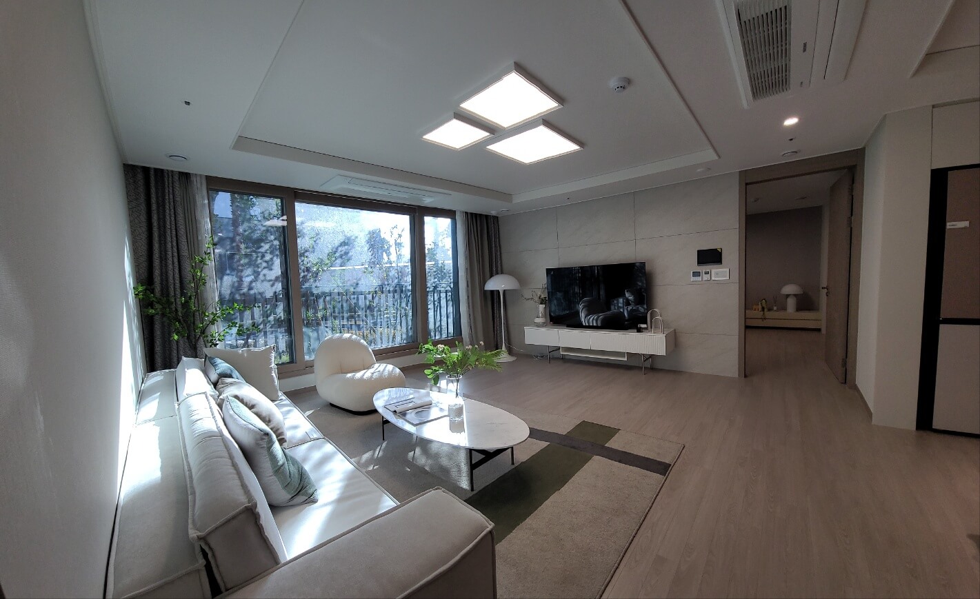 거실: 넓은 개방형 구조, 탁 트인 창으로 채광 극대화 주방·식당 분리형 구조: 독립적인 공간 활용 가능