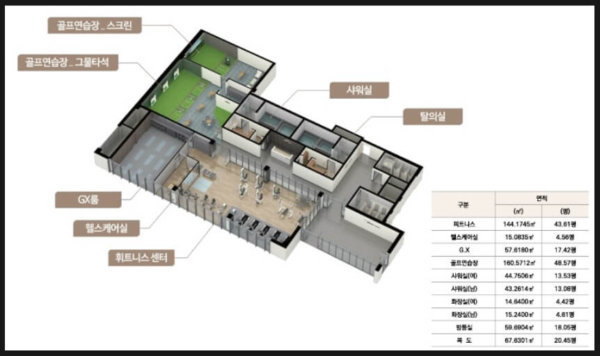 - 고급 커뮤니티 시설 – 피트니스센터, 골프연습장, GX룸, 수영장 등
