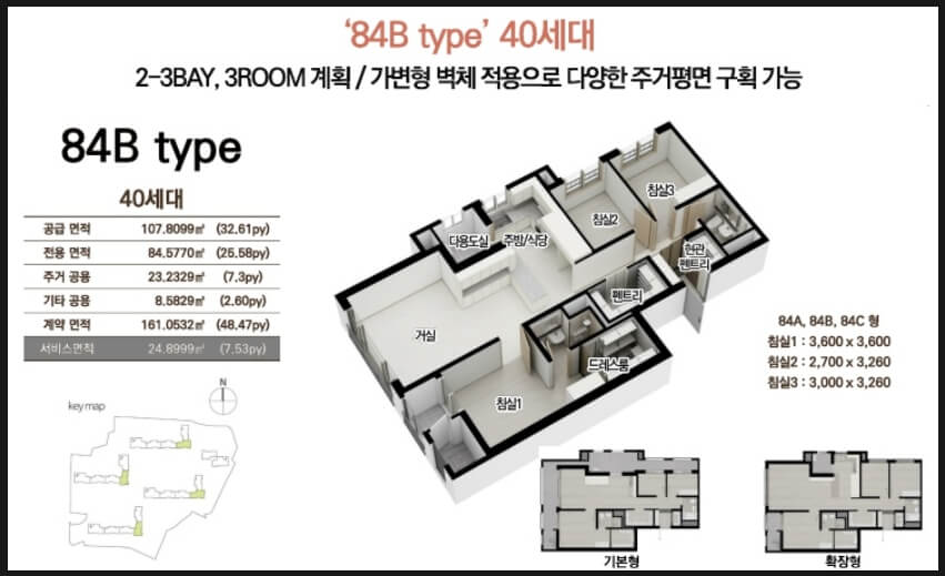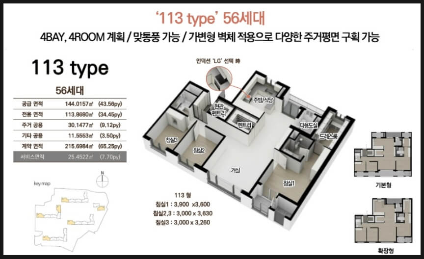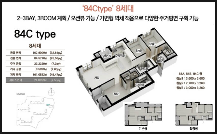 84㎡ 타입: 실용적인 판상형 구조, 넉넉한 수납공간(현관 워크인 수납장, 복도 팬트리) 113㎡ 타입: 대형 드레스룸과 마스터룸 제공, 개방감이 뛰어난 거실 설계 43평형 (133㎡): 대형 면적을 선호하는 분들을 위한 설계, 별장처럼 사용 가능 특히 84㎡ 국민주택 규모에서도 알파룸과 실내 팬트리가 적용되어 기존 크기보다 더욱 넓은 실내 공간 활용이 가능합니다.