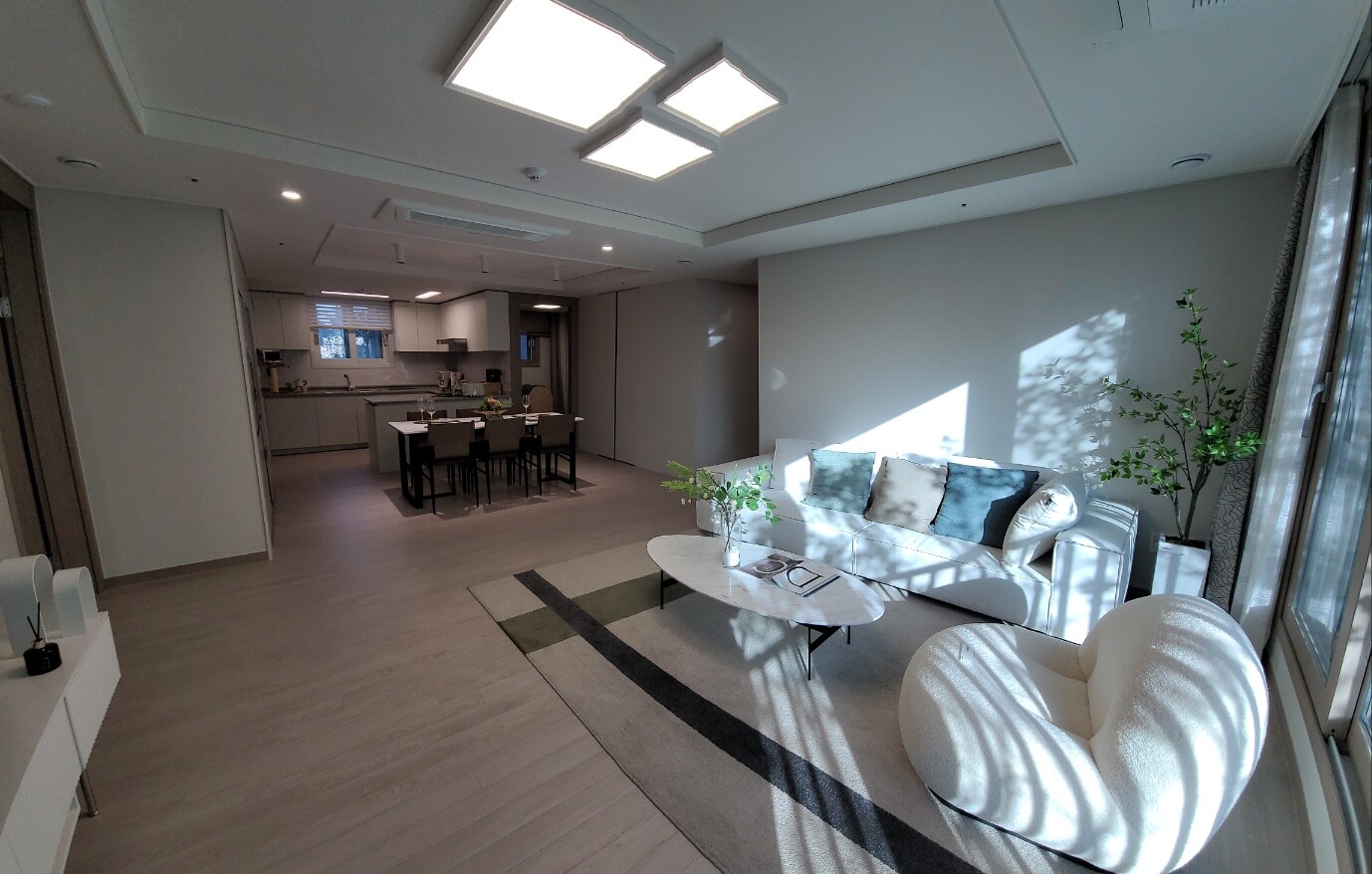 거실: 넓은 개방형 구조, 탁 트인 창으로 채광 극대화 주방·식당 분리형 구조: 독립적인 공간 활용 가능