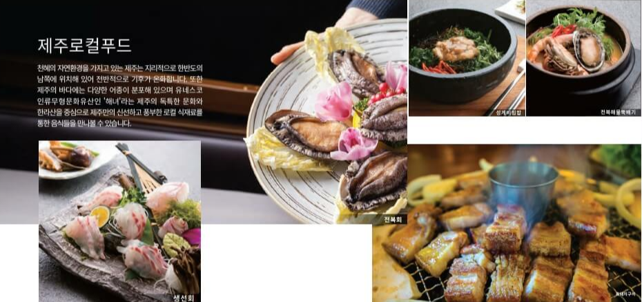 천혜의 자연환경을 가지고 있는 제주는 지리적으로 한반도의 남쪽에 위치해 있어 전반적으로 가후가 온화합니다, 또한 제주의 바다에는 다양한 어종이 분포해 있으며 유네스코 인류무형문화유산인 해녀라는 제주의 독특한 문화와 한라산을 중심으로 제주만의 신선하고 풍부한 로컬 식재료를 통한 음식들을 만나볼 수 있습니다.