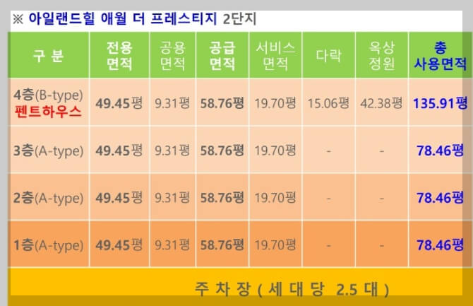 제주 아일랜드힐 2차의 각 세대는 163.5㎡(49.45평)의 전용면적을 갖추고 있으며, **서비스 면적 65.1㎡(20평)**까지 더해져 총 계약 면적은 **259.4㎡(78.5평)**에 달합니다. 특히 4층 펜트하우스는 총 사용 면적이 **449.3㎡(136평)**에 달해 넉넉한 공간에서 제주 생활을 즐길 수 있습니다.