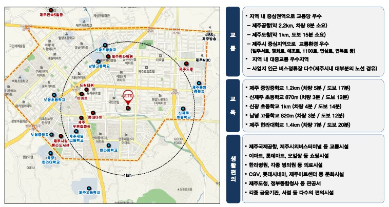 반경 1km 이내에 신제주 초등학교와 제주 중앙중학교가 위치해 있어 자녀들이 도보로 통학할 수 있습니다. 또한, 남녕 고등학교와 제주 한라대학교도 가까이 있어 교육 환경이 매우 우수합니다. 도보와 차량으로 접근 가능한 다양한 교육 시설은 자녀 교육에 최적화된 환경을 제공합니다.