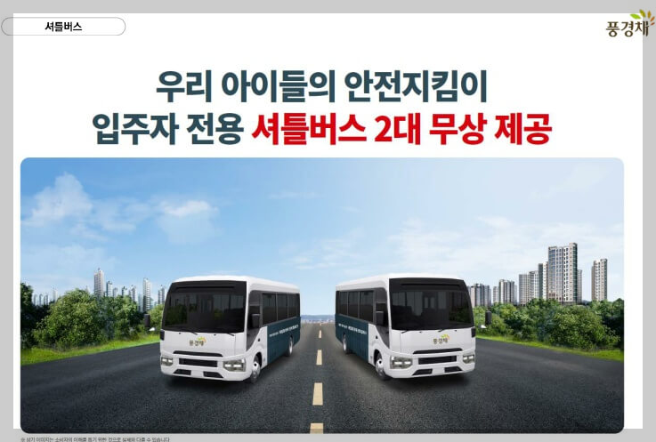 아이들의 안전한 통학을 위해 셔틀버스 2대도 제공할 계획입니다. 이는 가족 단위 수요자들에게 큰 장점으로 작용하며, 안전하고 편리한 생활환경을 제공합니다.