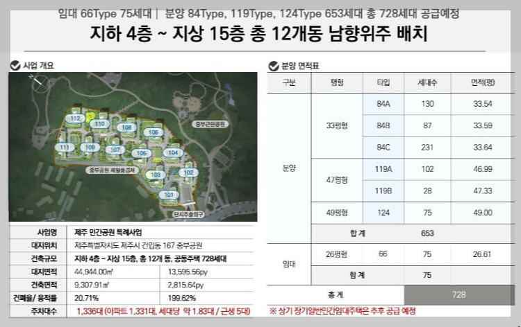 단지는 제주도 제주시 건입동 일원에 위치해 있으며, 지하 4층에서 지상 15층까지 12개 동으로 구성되어 있습니다. 총 728 가구 중 전용면적 84~124㎡의 653 가구가 일반 분양됩니다. 다양한 전용면적 옵션으로 수요자들의 다양한 요구를 충족시킬 수 있습니다.