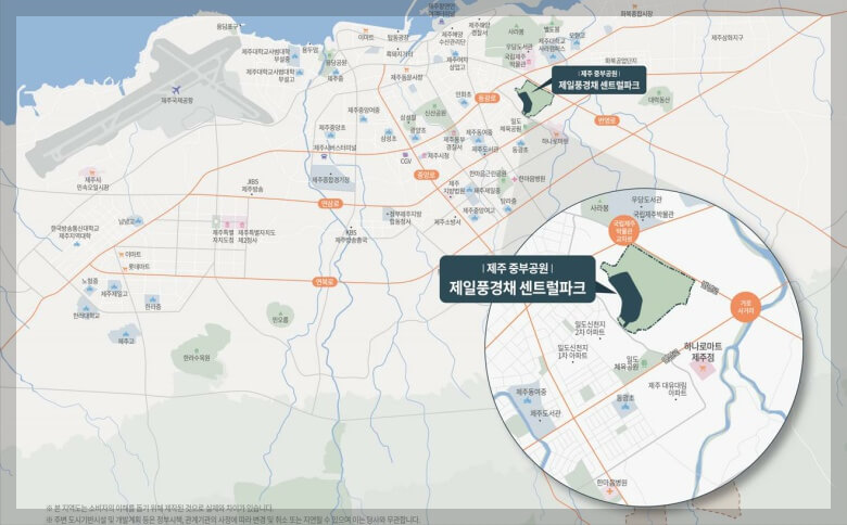 제일건설이 공급하는 제주 중부공원 제일풍경채 센트럴파크는 민간공원 특례사업 분양 단지로서 희소성과 상징성을 갖추고 있습니다. 함께 조성되는 중부공원은 약 17만㎡로 축구장 약 24배 크기의 대규모입니다. 숲과 화원, 하늘숲길, 야외 공연장, 체육시설 등이 조성될 계획으로, 쾌적한 생활 환경을 제공합니다.