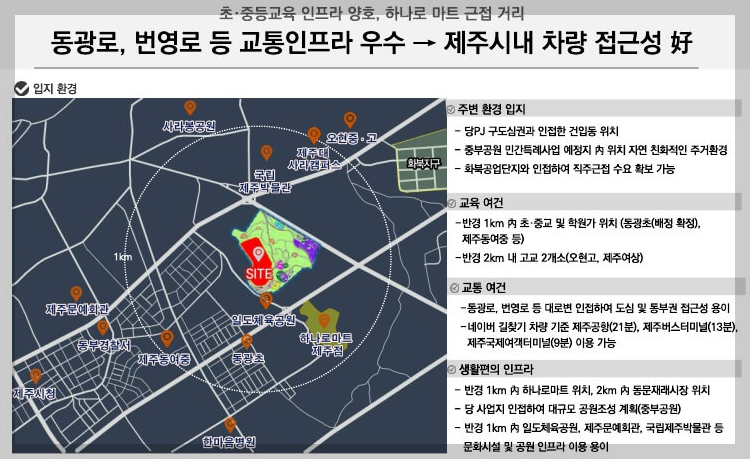 반경 1km 內 초. 중교 및 학원가 위치(동광초(배정확정), 제주동여중 등)