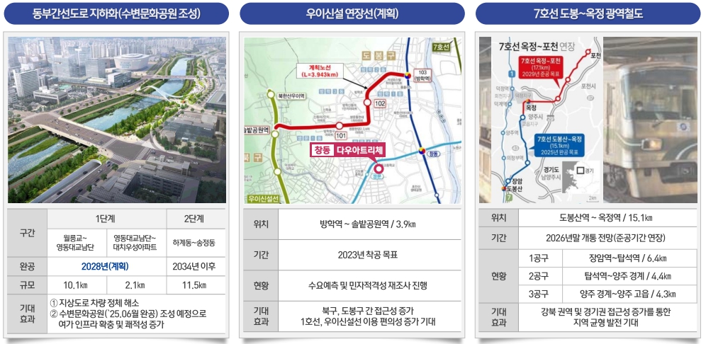 도봉구는 지역 및 광역 교통망을 확대하고 있으며, 다양한 일자리 창출 및 대규모 재개발/재건축 프로젝트를 추진 중입니다. 또한, 창동 지역은 창동주공 단지의 재건축과 도봉구 전체 차량교통망 개선으로 미래의 중심으로 자리매김할 것으로 전망됩니다.