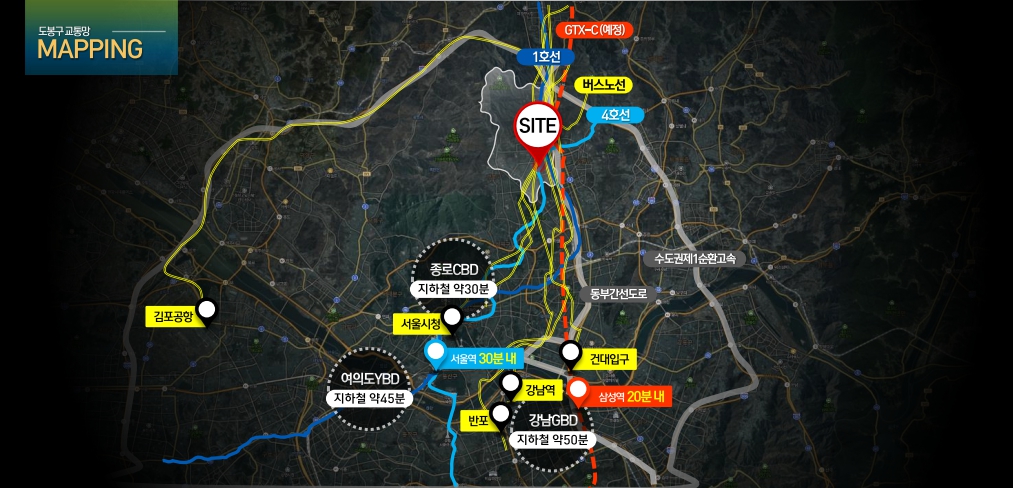 창동 다우아트리체는 교통 접근성이 뛰어나며, 4호선, GTX-C(예정), 그리고 다양한 버스노선을 통해 서울의 주요 지역에 빠르게 이동할 수 있습니다. 도봉구는 편리한 교통망으로 거주민 만족도가 높은 지역이며, 창동 지역은 미래 중심지로 떠오를 것으로 예상됩니다.