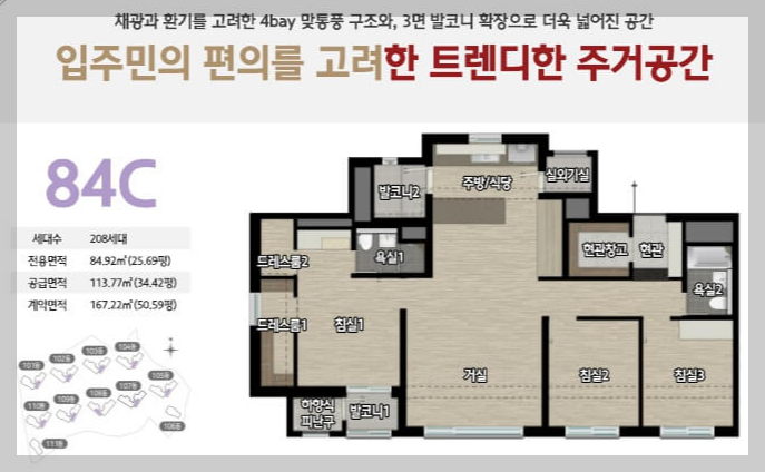 채광과 환기를 고려한 4bay 맞통풍 구조와, 3면 발코니 확장으로 더욱 넓어진 공간