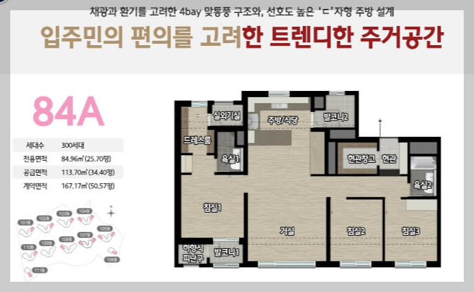 채광과 환기를 고려한 4bay 맞통풍 구조와, 선호도 높은 'ㄷ'자형 주방 설계