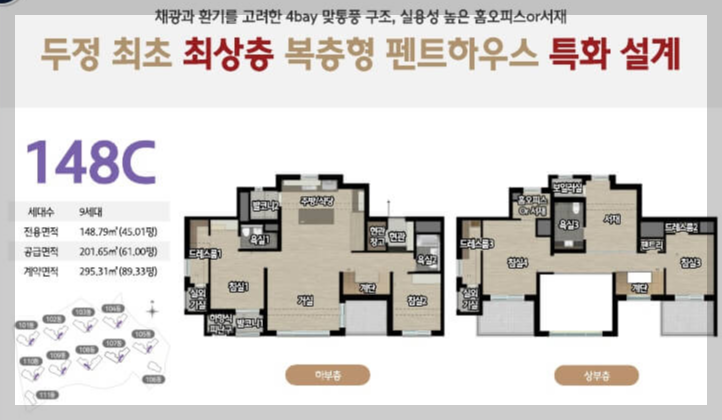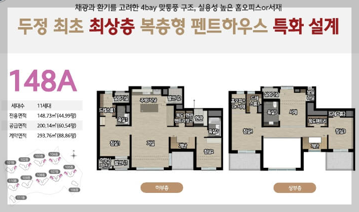 채광과 환기를 고려한 4bay 맞통풍 구조, 실용성 높은 홈오피스 or 서재 두정 최초 최상층 복층형 펜트하우스 특화 설계 148A