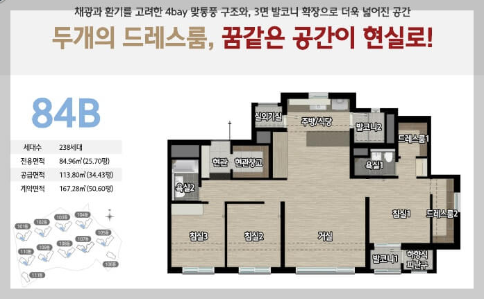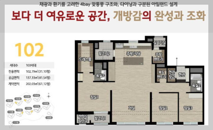 채광과 환기를 고려한 4 bay 맞통풍 구조와, 3면 발코니 확 자응로 더욱 넗어진 공간