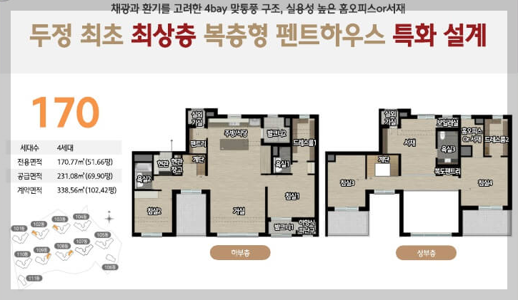 채광과 환기를 고려한 4bay 맞통풍 구조, 실용성 높은 홈오피스 or 서재 두정 최초 최상층 복층형 펜트하우스 특화 설계 170