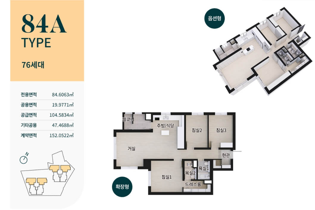 모든 세대가 선호하는 전용 84㎡ 구조로, 넓고 효율적인 공간을 제공합니다. 드레스룸과 발코니 설계로 공간 활용도를 극대화했습니다.
