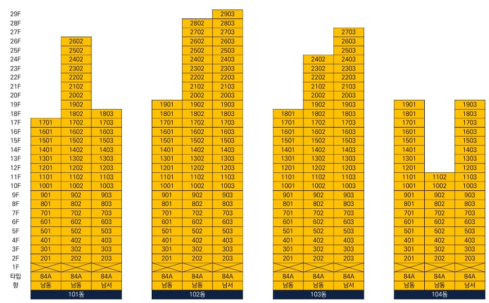 건축 개요를 살펴보면 지하 2층~지상 29층, 총 4개 동, 243세대로 구성되었습니다. 주차장은 총 388면으로 확보되어 가구당 약 1.6대의 주차 여유가 있어 차량 동선에도 불편이 없습니다. 단지 구조는 4개 주동을 나란히 배치해 시선 간섭을 최소화하고, 각 세대의 남향 배치를 통해 자연 채광을 극대화했습니다.