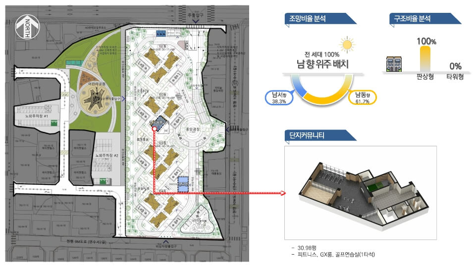 단지 내 커뮤니티는 총 33평 규모로 구성되며 피트니스 센터, GX룸, 골프연습장, 필라테스 시설 등을 갖춰 입주민의 건강과 여가 활동을 지원합니다. 경로당도 마련되어 노년층을 고려한 시설 설계가 돋보입니다.