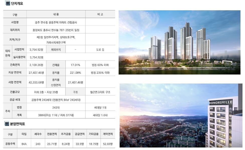 해당 프로젝트는 국내 1군 건설사인 경남아너스빌이 시공을 담당하며, 뛰어난 공간 설계와 편의성을 구현했습니다. 위치는 충청북도 충주시 연수동 787-25번지 일원으로 제2종 일반주거지역에 속하며, 대지면적은 총 3,754.92평, 연면적은 42,333.68평으로 단일 단지로서 랜드마크 단지의 위상을 갖추었습니다.