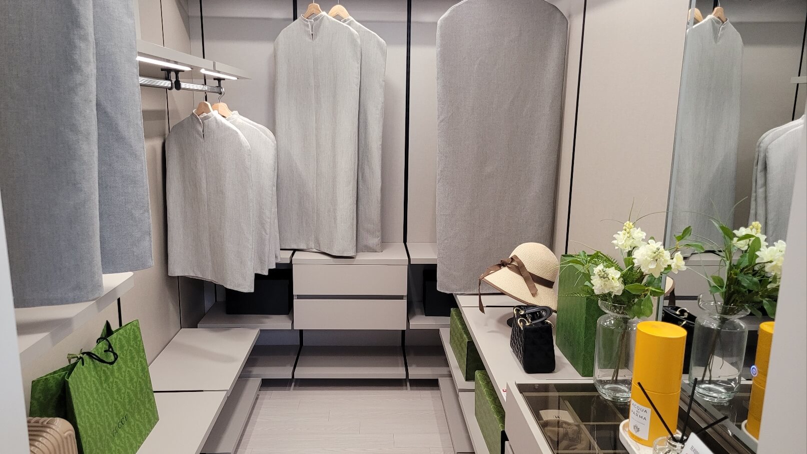 거실 폭은 5.7m의 초광폭 설계를 적용해 개방감과 채광량을 높였으며, 발코니는 세탁실과 다용도로 활용 가능합니다. 드레스룸에 창호를 설치해 의류 관리가 편리하며, 주방과 거실을 연결한 와이드 구조로 공간 효율을 높였습니다.