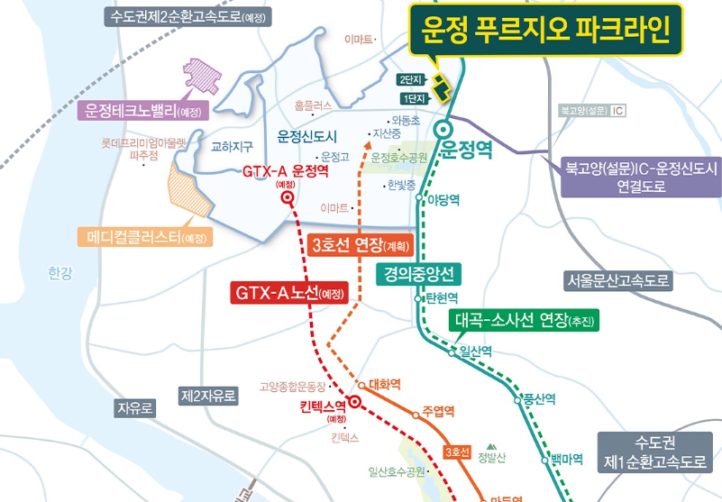 2024년 하반기에는 운정신도시에 GTX-A(운정역)가 준공될 예정이다. 이는 수도권 교통난 해소와 장거리 통근자의 부담 완화를 위한 핵심 교통망으로, 개통 후 파주에서 서울역까지 20분 이내의 이동이 가능해진다. 미래에는 운정에서 화성 동탄까지도 단 45분으로 이동할 수 있을 전망이다. 이에 따라 운정역 주변 단지의 가치가 상승하고 있으며, '운정 푸르지오 파크라인' 또한 해당 흐름에 따라 가치가 높아지고 있는 상황이다.