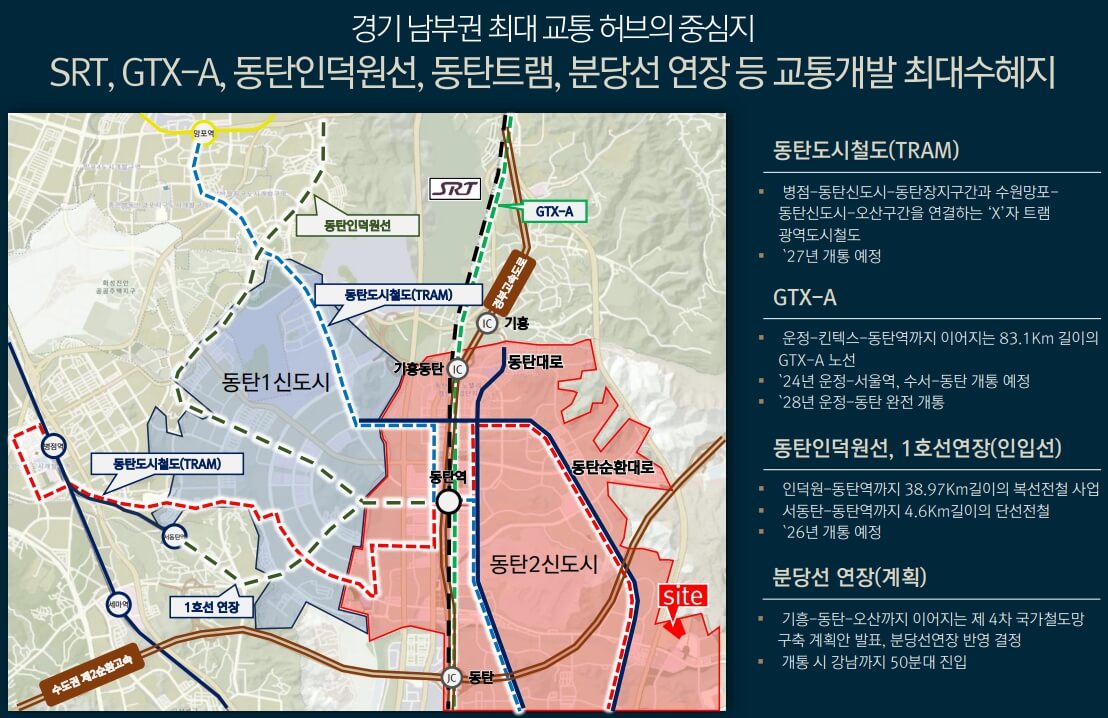 반경 1km 내 동탄 트램 신동역(가칭) 개통 예정 23번 국도, 대로변 인접으로 동탄 시내권 이동 편리 반경 3km SRT, GTX-A동탄역 위치