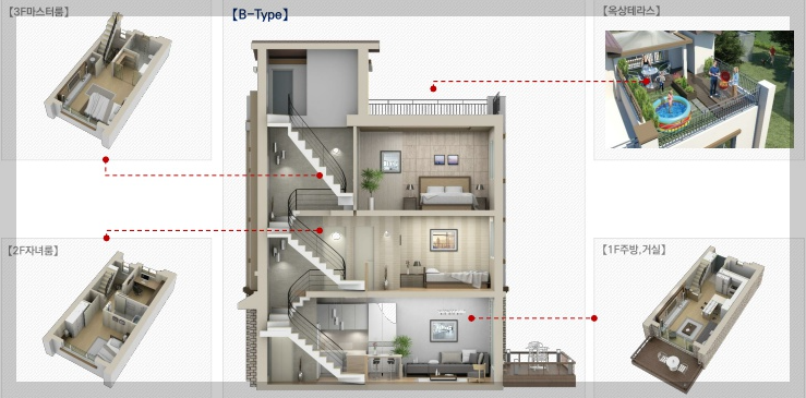 자연과 함께 힐링할수 있는 옥상정원은 작은카페나 미니 수영장으로변신하며 가족 구성원의 기호에 맞게 미니정원, 바베규장으로 활용할수 있습니다. 1가구 3Room의 수직구조로 층마다 공간의 효율성과 프라이버시가 존중되며 독립적인 1가구 3층 수직구조로 설계되어 이웃간의 층간 소음 걱정이 없습니다. 또한 테라스하우스에 적합한 철근 콘크리트 구조로 설계,시공하여 보다 튼튼합니다