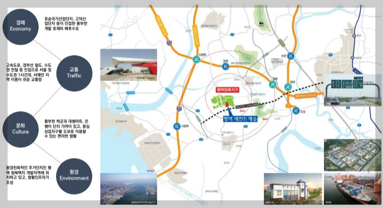 평택 청북신도시는 포승국가산업단지,고덕산업단지 등이 인접한 풍부한 개발호재와 배후 수요등 서울 및 수도권 1시간대, 서해안 지역 이동이 쉬운 교통망