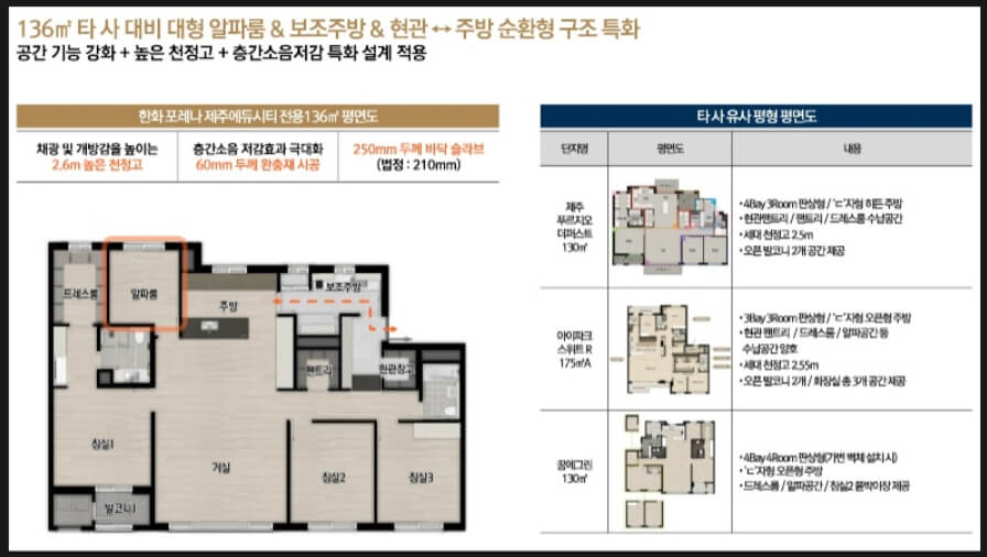 각 세대는 특화된 설계가 돋보이는데, 84㎡(112세대)는 4 Bay 판상형 맞통풍 구조와 넉넉한 수납공간이 특징입니다. 99㎡A(130세대)는 넓은 드레스룸과 방 4개를 갖추고 있으며, 136㎡(119세대)는 현관창고와 팬트리 등 넓은 공간이 특징입니다. 특히 136㎡는 현관에서 보조주방으로 바로 연결되는 'Two-Way'로 설계되어 소비자들의 관심을 모으고 있습니다. 다양성은 제주에서 중소형부터 대형까지 다양한 사이즈의 가구를 원하는 고객들에게 맞춤형 선택을 제공할 것으로 보입니다.