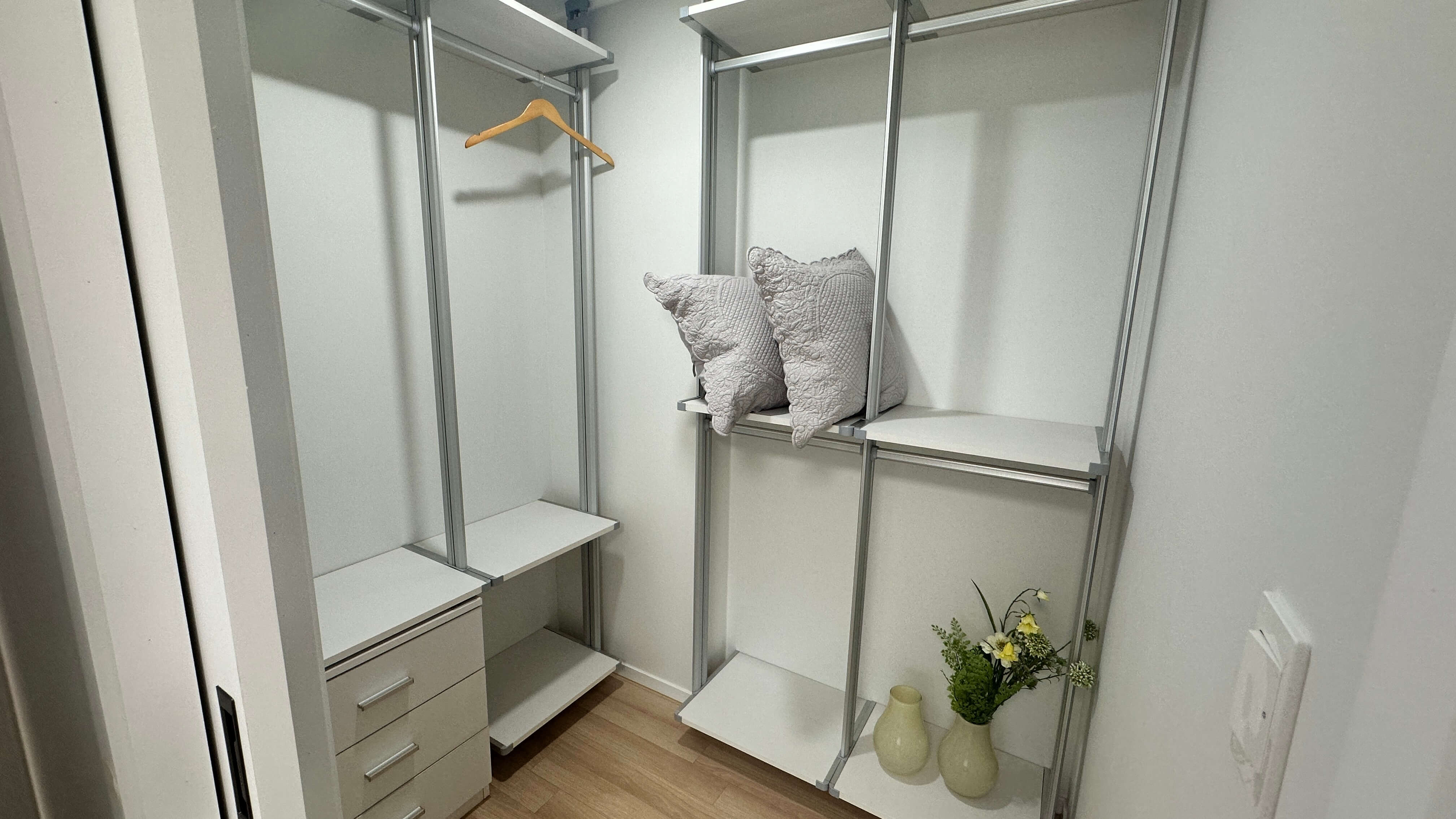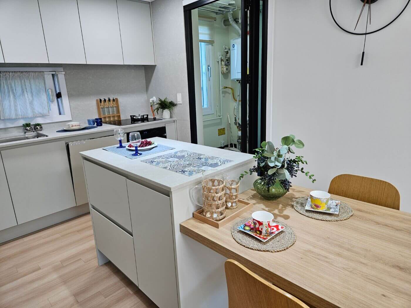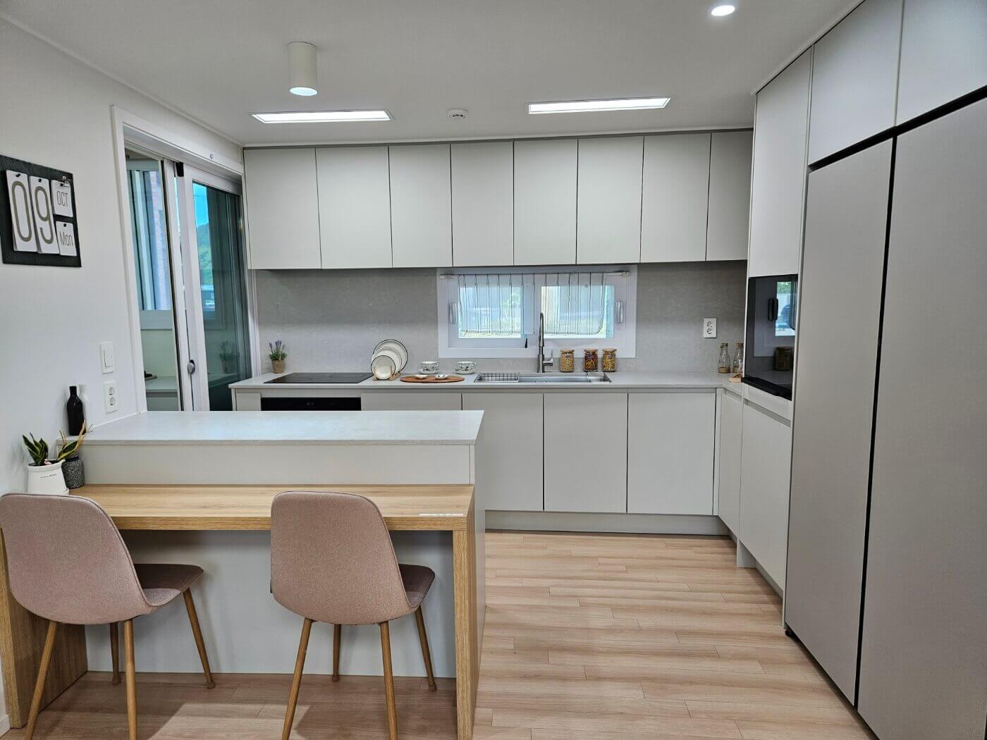 복도에 위치한 팬트리와 보조주방은 짐 정리를 편리하게 해 주며, 가스레인지까지 갖춰 조리 편의성을 높였습니다.