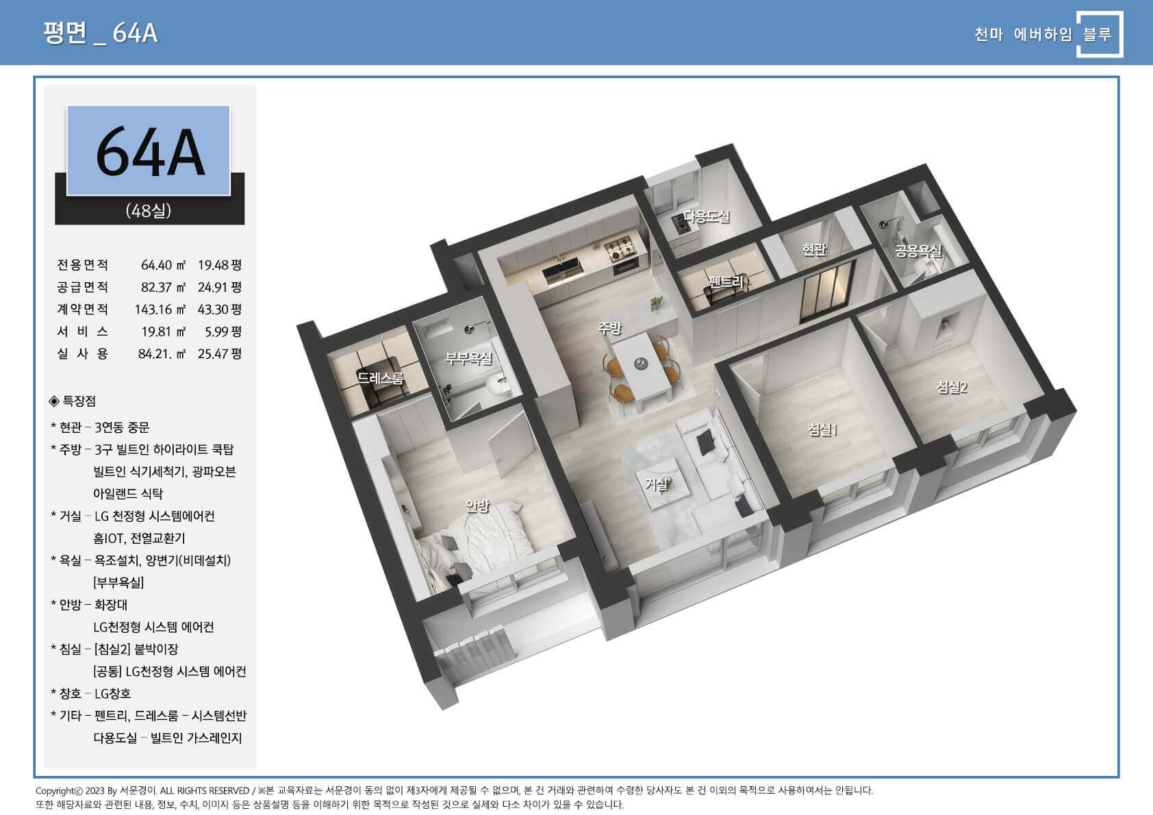 거실 겸 주방, 다용도실, 드레스룸, 팬트리까지 제공 입주민의 생활 편의를 위한 다양한 옵션 포함 시스템 에어컨, 3 연동 중문, 식기세척기, 광파오븐, 아일랜드 식탁 등 고급스러운 인테리어와 실용적인 설계, 천마 에버하임 블루의 내부는 실용성과 고급스러움을 동시에 갖춘 공간입니다.