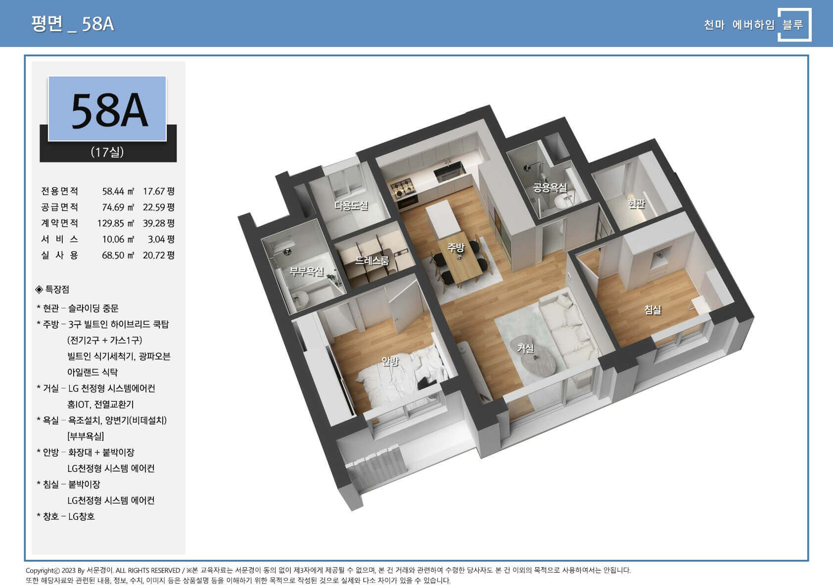 64㎡와 58㎡ 중소형 평수로 구성된 천마 에버하임 블루는 전용면적 약 20평, 실사용 면적 약 25평으로 공간 효율성을 극대화한 구조를 자랑합니다.