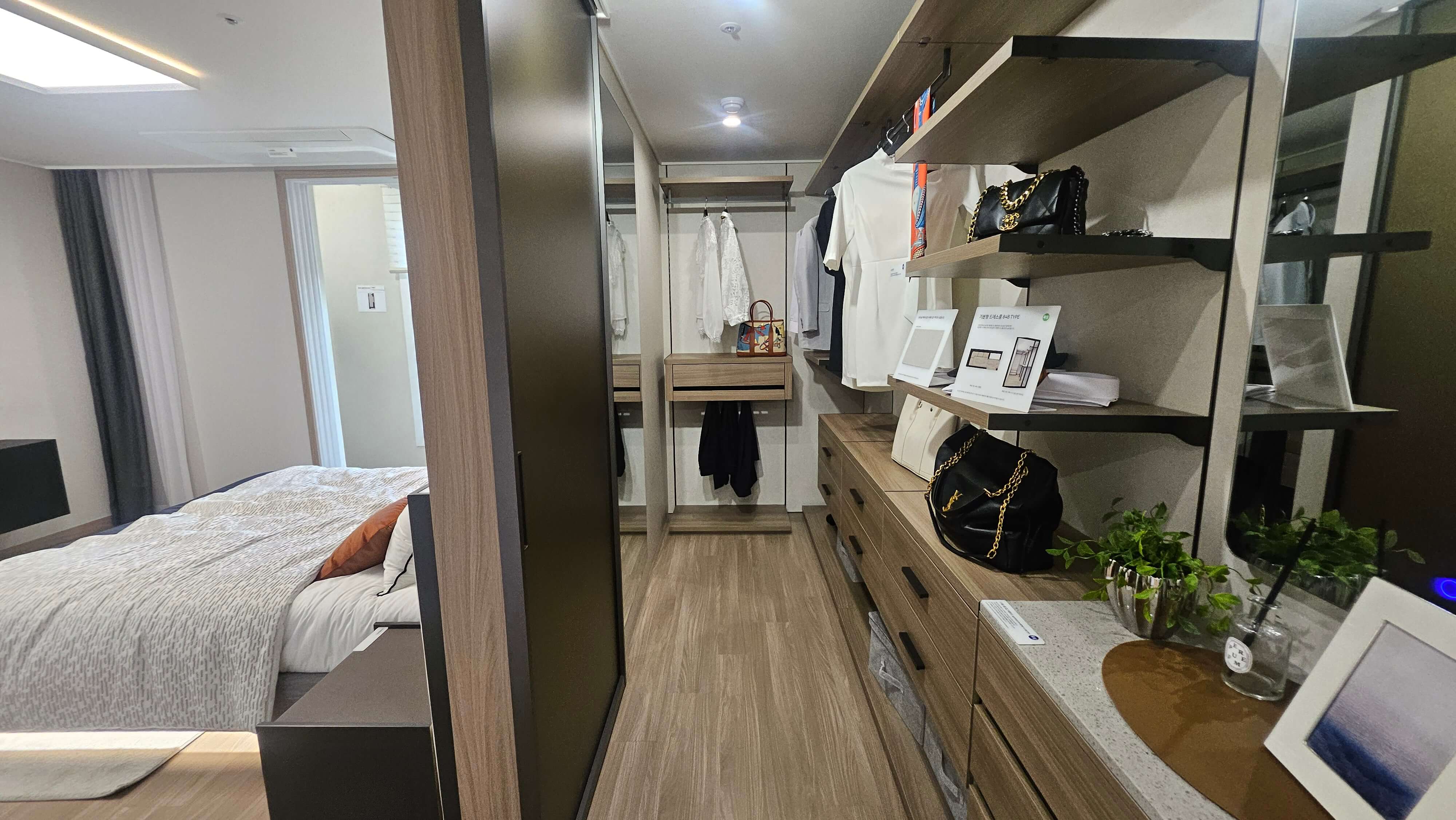 안방에는 시스템 드레스룸이 시공되어 여유로운 수납이 가능하며, 워크인 팬트리와 주방 수납장으로 공간 활용도를 높였습니다.